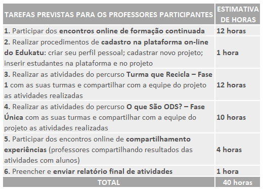 Os professores que aderirem voluntariamente ao projeto deverão cadastrar os estudantes de suas turmas na plataforma on-line Edukatu e realizar as atividades propostas para cada etapa de ensino do Percurso Turma que Recicla – Fase 1 e do Percurso O que são ODS? – Fase Única.