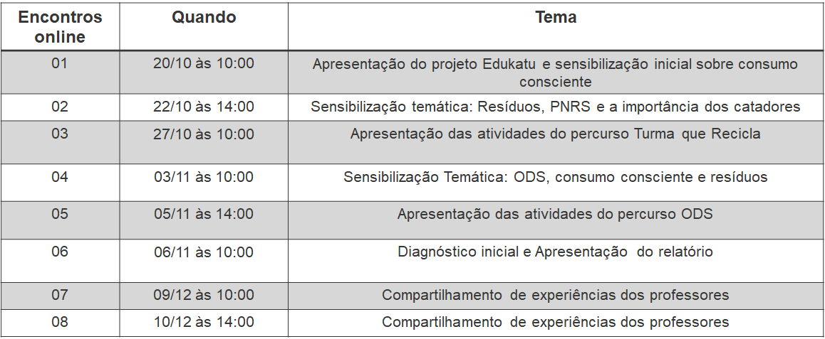 Os encontros online tem como objetivo oferecer aos professores, coordenadores pedagógicos e gestores das escolas que se inscreveram no projeto, a formação continuada em consumo consciente e sua relação com resíduos sólidos e os ODS, bem como as orientações técnicas para desenvolvimento das atividades.