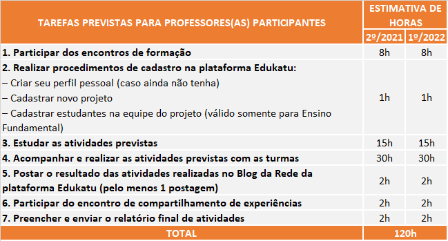 Os professores que aderirem ao projeto e realizarem todas as tarefas indicadas no quadro abaixo receberão certificado de 120 horas, já os coordenadores e gestores receberão um certificado de 90 horas.