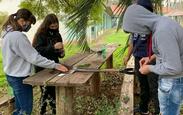 Este é o primeiro ano que trabalhamos consumo consciente e sustentabilidade. Foi ideia dos próprios alunos trabalharem a coleta dos resíduos, uma vez que observaram a necessidade da sensibilização da comunidade escolar. Os alunos do nono ano, fizeram oficinas com alunos do fundamental I sobre a coleta seletiva de resíduos. Também distribuíram lixeiras pelo pátio da escola.