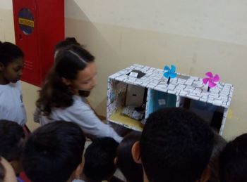 Nossa feira de Ciências foi muito legal! Fizemos a exposição de maquetes de uma hidroelétrica e de energia eólica. Montamos uma casa sustentável, com diferentes fontes de energia e muitas dicas de como economizar energia elétrica. Convidamos os colegas de outras turmas para apreciar nossas maquetes e aprender um pouco mais sobre fontes de energia, assistir vídeos sobre economia de energia e jogar um jogo de percurso.