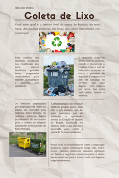 E na sua cidade? Como é seu bairro ou o bairro da sua escola? Tem coleta seletiva? Tem algum PEV (Ponto de Entrega Voluntária) próximo da escola? Onde você pode entregar o material para reciclagem? E o lixo eletrônico? Onde vocês podem descartar? Tem lixo nas ruas? No chão da escola?